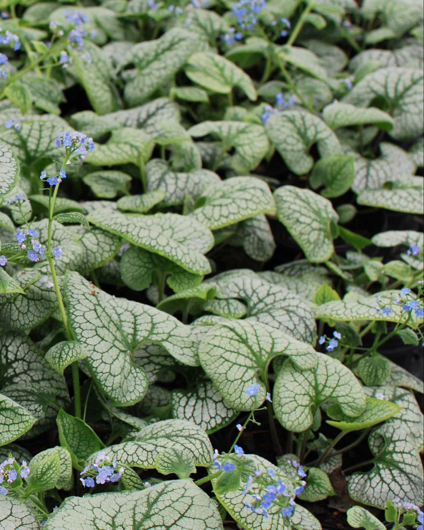 Noteworthy for its exceptional tolerance of heat and humidity, 'Sea Heart' also blooms a couple of weeks earlier in spring than 'Jack Frost' and has two-tones pink and blue flowers. The 6-12" tall foliage has thick leaves that are heart-shaped and green with an intricately patterned silvery overlay. Plant 12" apart.