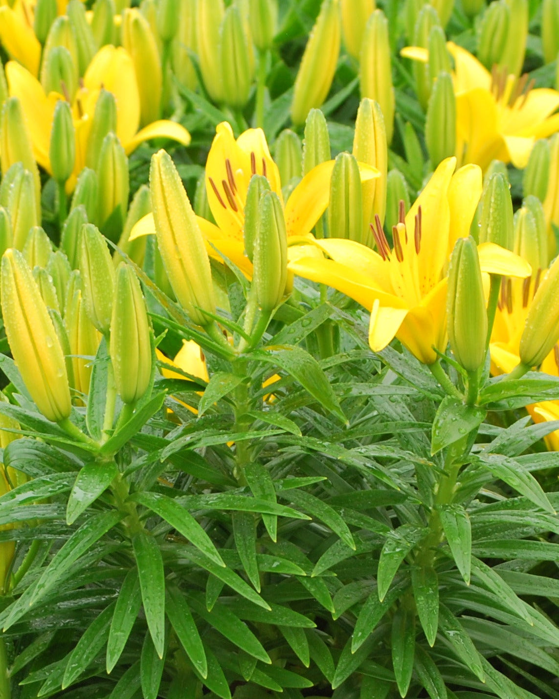 Bursting with color in early to mid-summer, these compact lilies are offered in many bold and beautiful colors with very high bud counts and are perfect for the front of the border, rock garden and containers or as a cut flower. 'Tiny Bee' blooms bright yellow with black spots near the center of the flower. Grows 12-14" tall and has 5-7 buds per stem. PP#16255