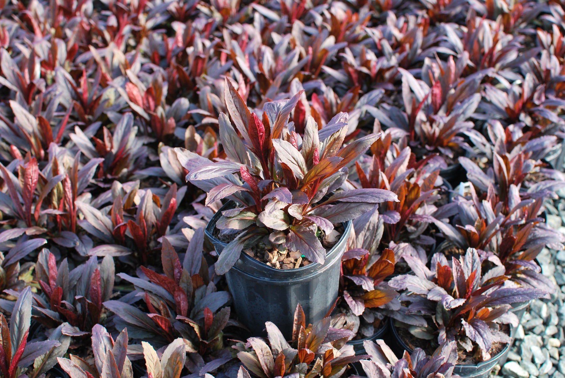 Emerging spring foliage is nearly black, transforming to deep maroon in summer and holding this color throughout the growing season. Brilliant red flowers bloom on 3-4" stems in August and September. Perfect water-side attraction for hummingbirds and butterflies. Prefers moist soil. Grows to 24" tall. PP#25687