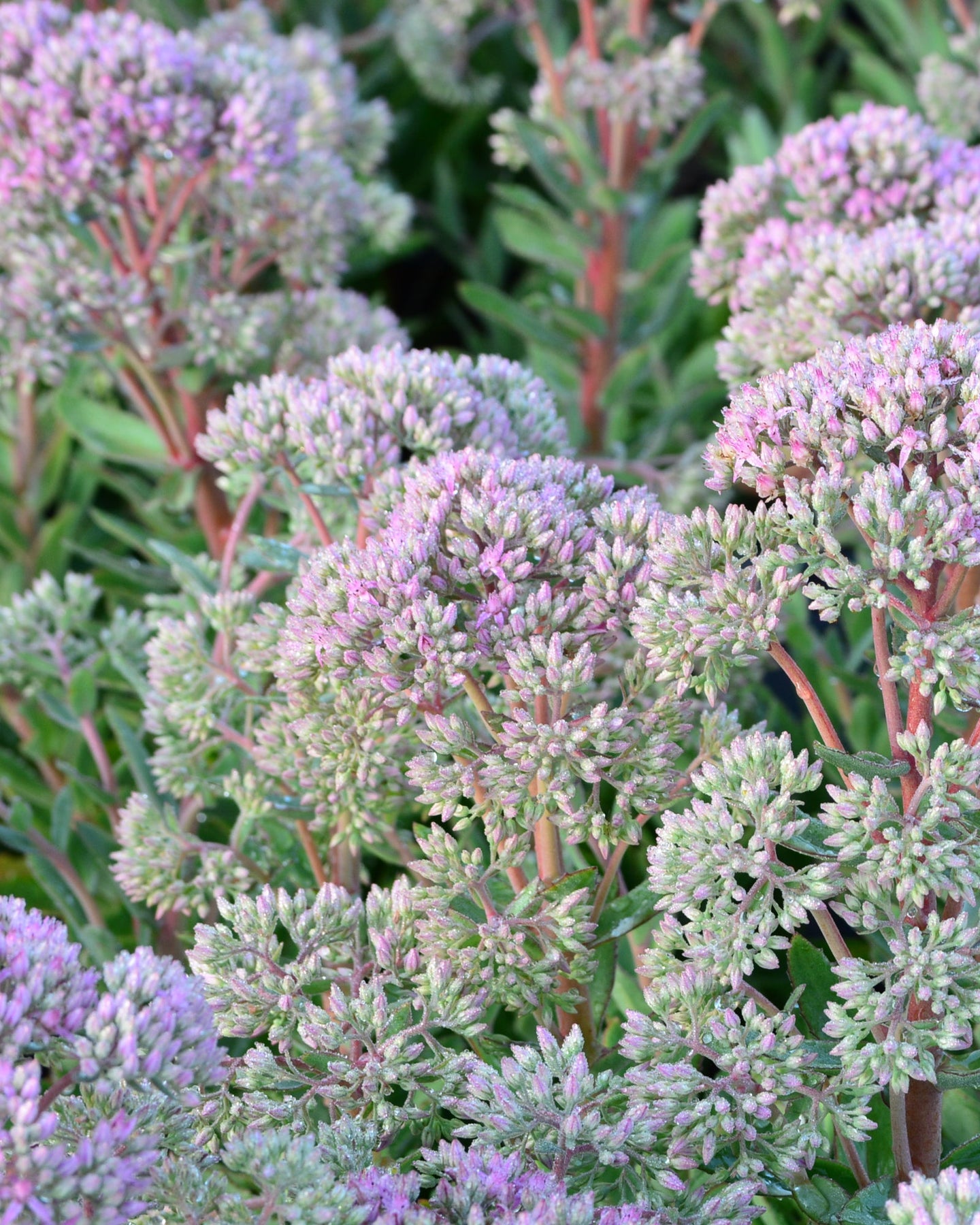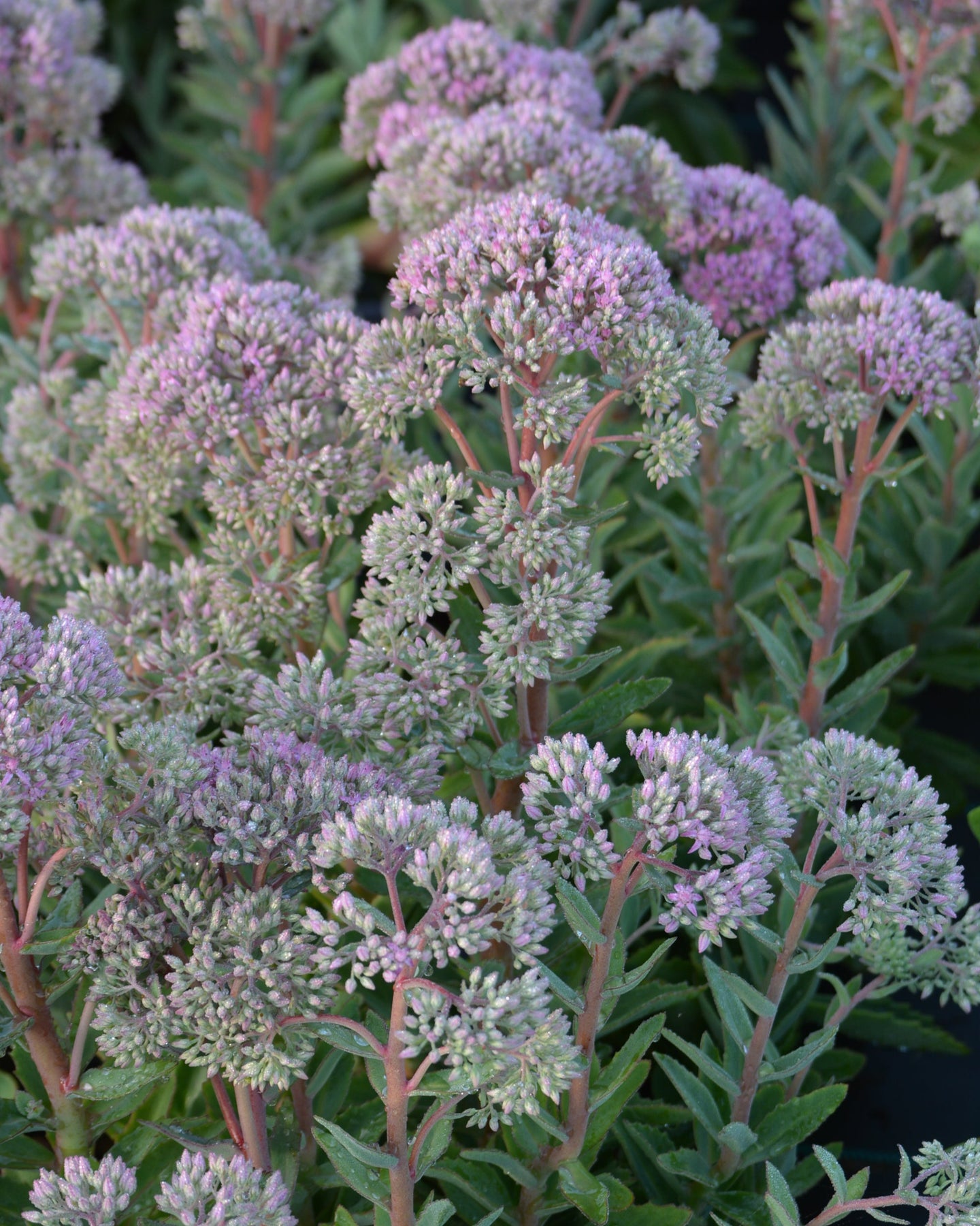 Sturdy upright blue-green foliage is adorned with pink buds and cerise-pink flower clusters in late summer. Blooms open a little earlier than 'Autumn Joy' and age to antique rose before the dark red seed heads develop. Height is 14-18". Bees and butterflies love 'Abbeydore'. Plant 18" apart.