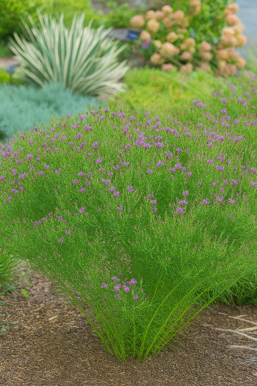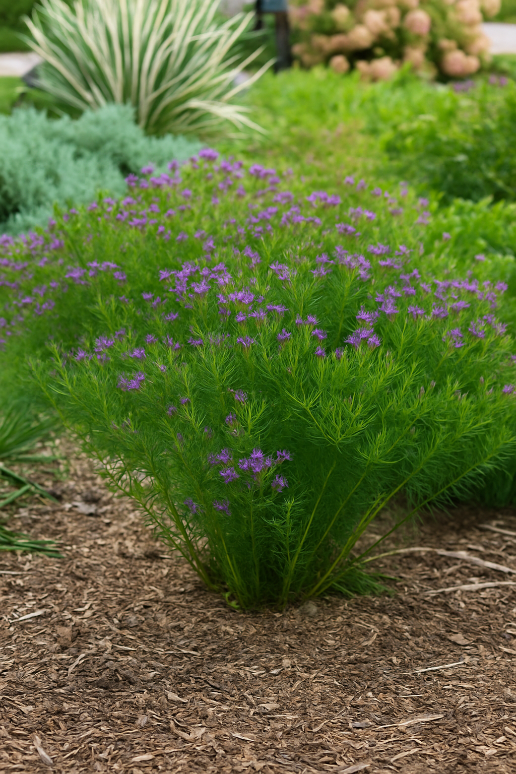 Offering late-season color and attractive Amsonia hubrichtii-like foliage, this Arkansas native is a vigorous grower and tolerant of poor, rocky soils. The fine-textured foliage grows about 3' tall and is topped with small, bright purple flowers in late summer.