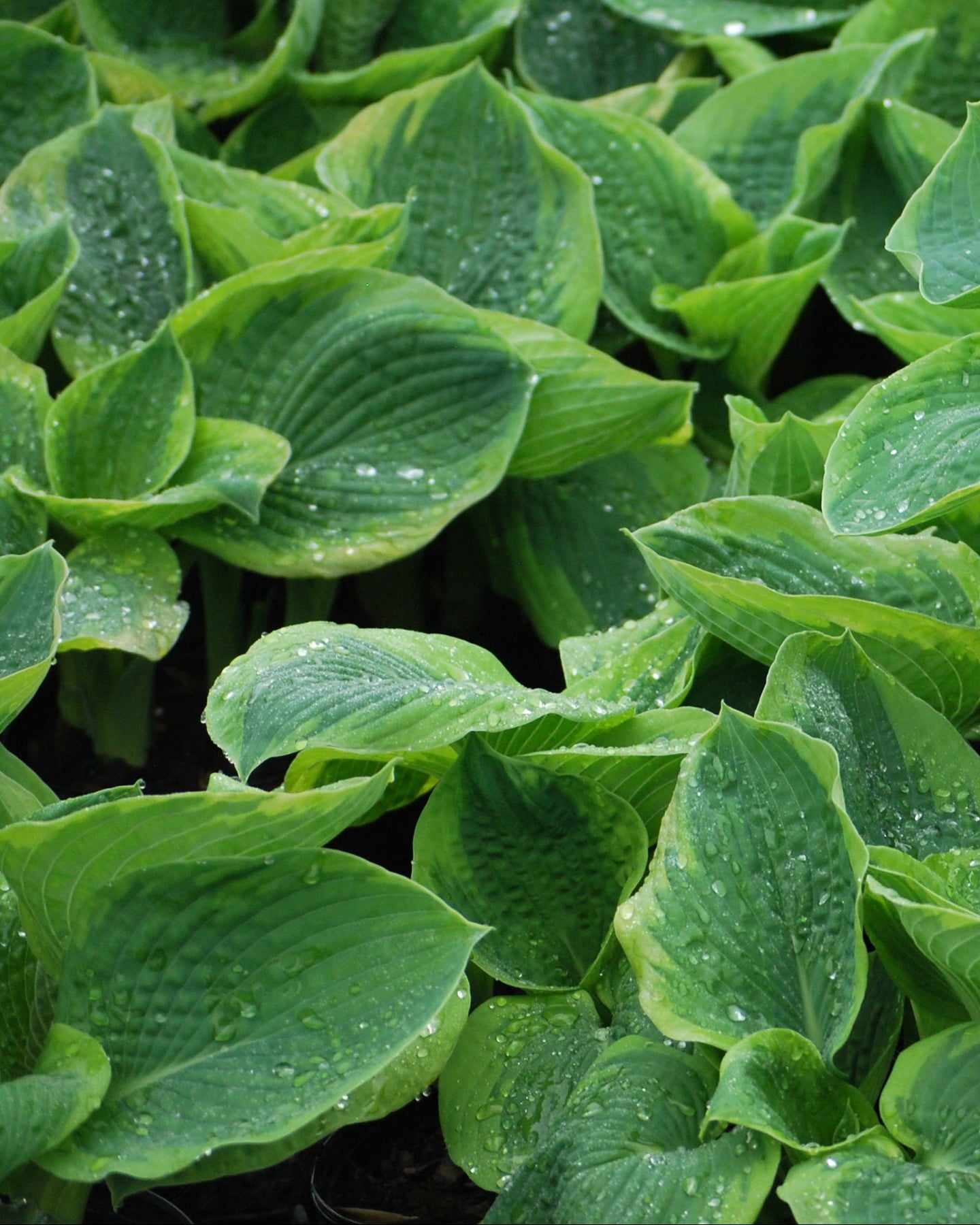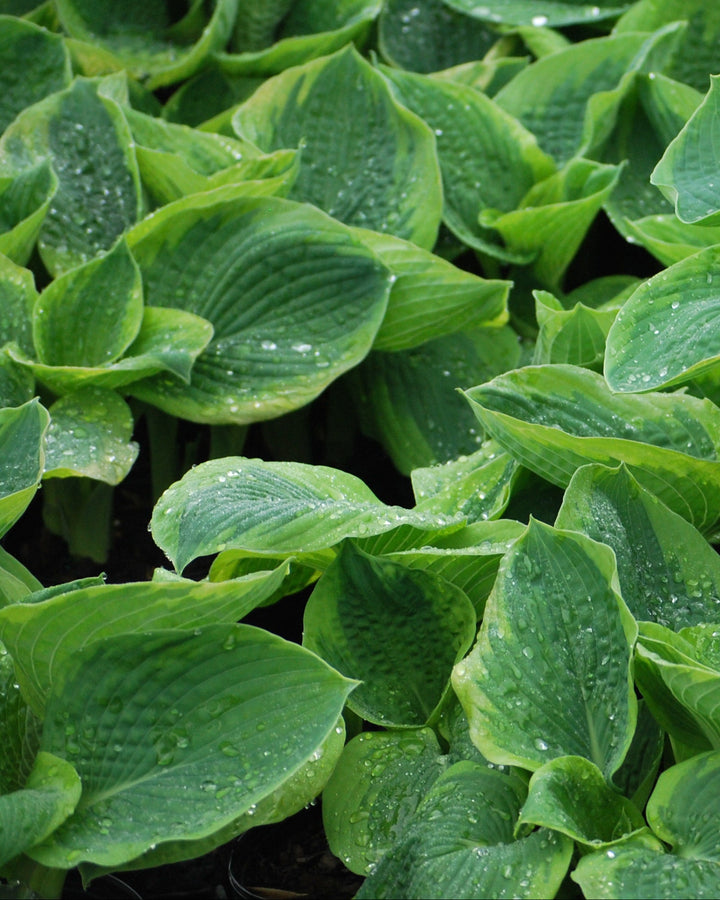 Favored by Hosta lovers and experts, this award winner forms a 28" high mound of heavily corrugated, wide blue-green leaves with a broad golden-yellow border. Near-white flowers in late June are displayed just above the handsome slug-resistant foliage.