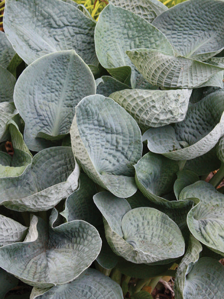 A quite sizable patron of the blue-leaved Hostas, 'Big Daddy' reaches 24" tall and 36" wide at maturity with rounded, puckered gray-blue leaves. Almost white flowers in mid to late summer top the large, mounded foliage. Medium growth rate and good slug resistance.
