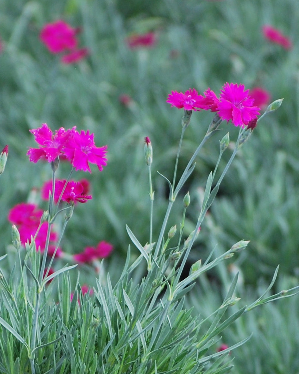 Wow! That's hot pink! Sweetly fragrant, the florescent pink fringed flowers jump out against the blue-gray foliage. 'Neon Star' thrives best with full sun and well-drained moderately dry soil. Compact at 6-8", it will bloom spring through fall. Combines well with Platycodon 'Sentimental Blue' and Festuca 'Elijah Blue'.