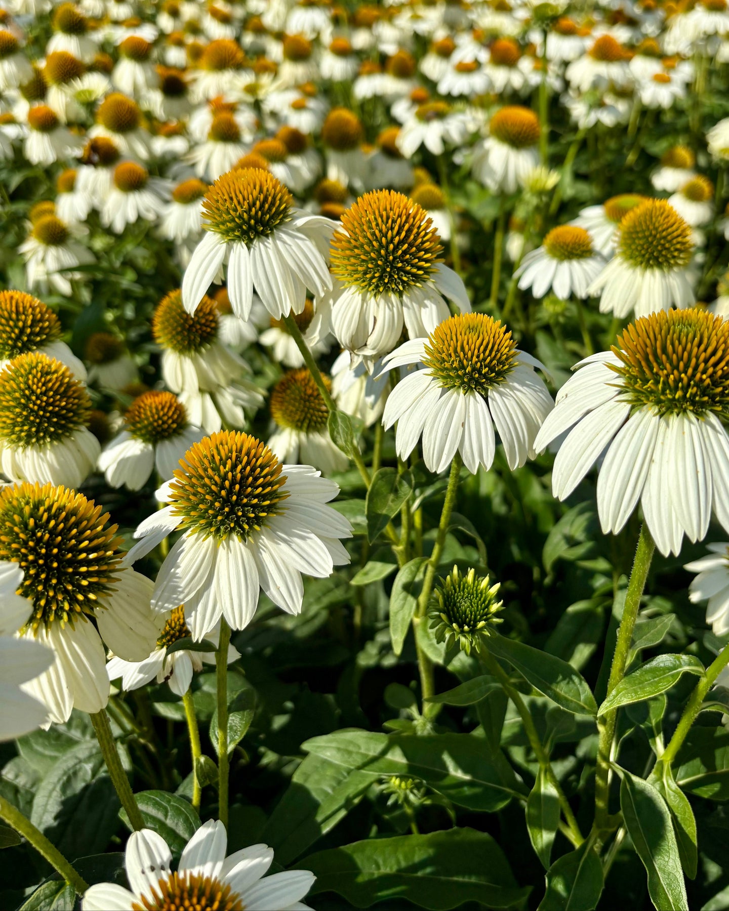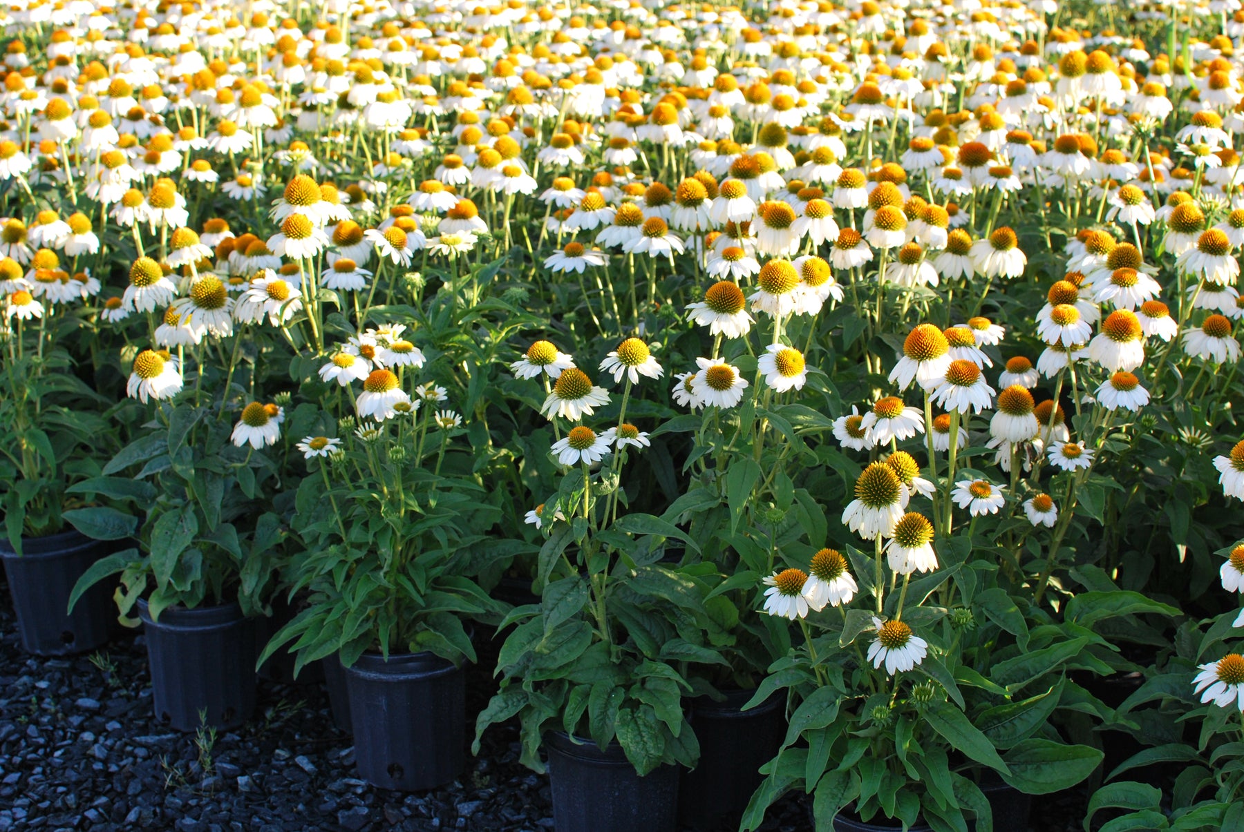 This compact coneflower is just under 2' tall and produces many large blooms with pure white petals surrounding a bronze-yellow cone. Very hardy with a well-branched habit, providing a nice alternative to taller varieties. Place in the middle of the border or in combination containers. Blooms from late spring to late summer.