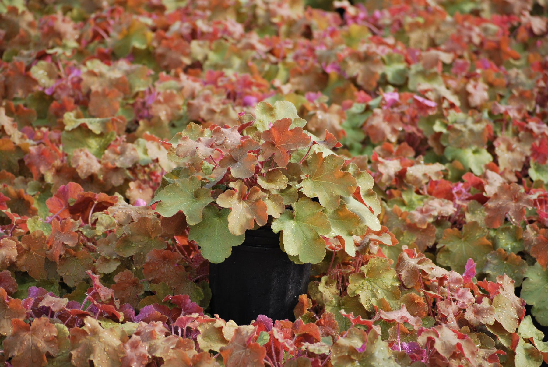 One of our most popular Heucheras, 'Caramel' is a vigorous grower with very good heat and humidity tolerance. It has golden caramel leaves with purplish undersides. Foliage grows to about 10" and white flowers appear in early to mid-summer. Try with Brilliance Autumn Fern, Anemone 'Whirlwind' and Carex 'Everillo'. PP#16560