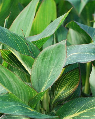 Talk about a tropical look, this rare, imported dwarf Canna is renowned for its striking variegated green, cream and yellow striped foliage with subtle "red-pencil" edging. Its large banana leaf qualities make it a gardener's dream. Removing flowering heads, which makes for tough decision-making, enhances foliage production. Foliage height is 2 - 21/2'. Its large orange flowers make it 4' overall. Plant 24" apart.