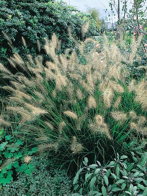 Fountain Grasses are about as versatile as any ornamental grass. This mound grower has finely textured, arching, rich-green leaf blades with rose/coppery-tan seed plumes or "fox tails" that appear on the tufts in August to October, then last all winter, reaching a height of 3-4'. It is used extensively for borders, in masses, as an accent or specimen plant, or incorporated in water or poolside plantings.