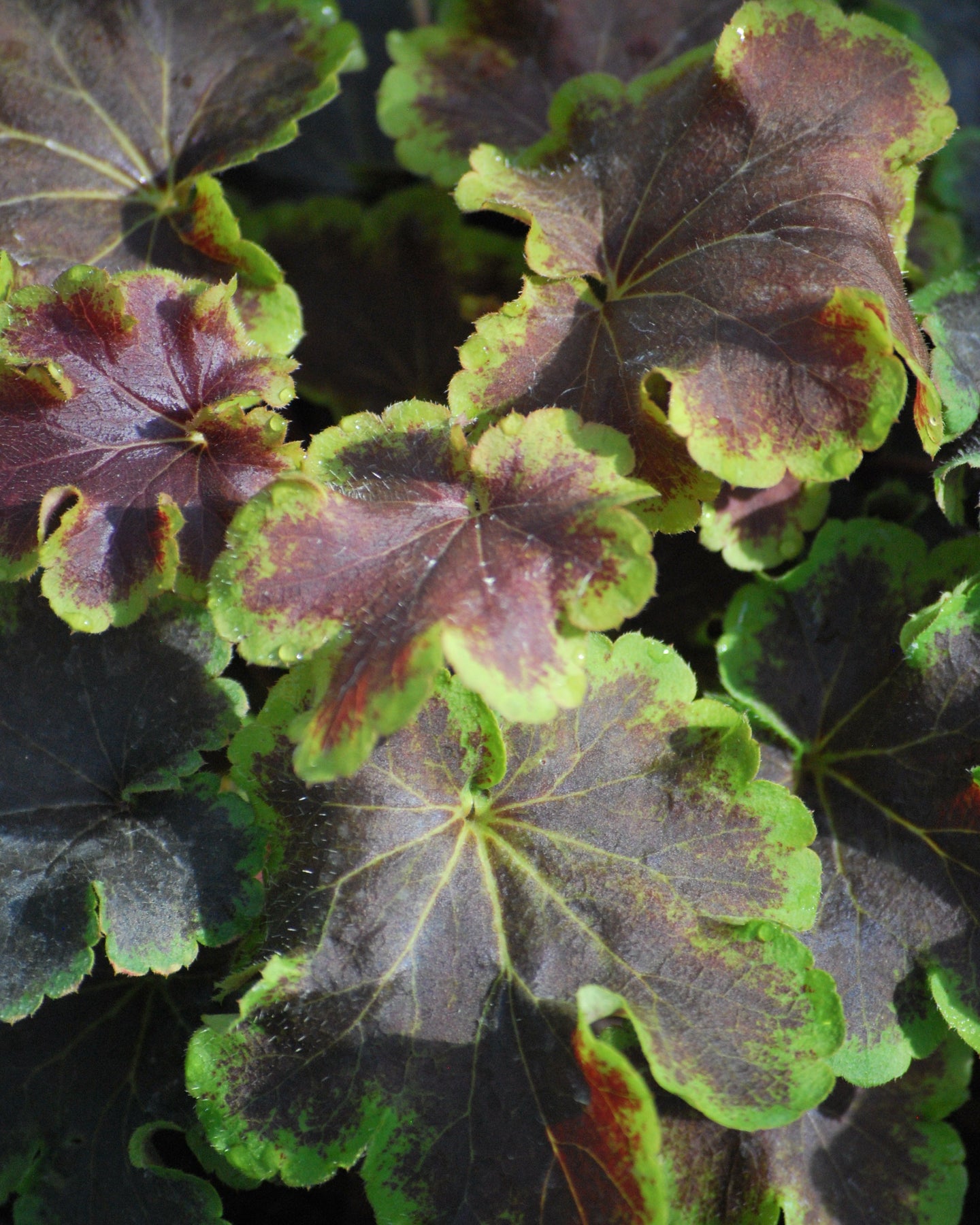 New leaves of lime-green with reddish splotches are eclipsed by solid dark reddish-brown centers as the season progresses. Scalloped lime-green margins add to the phenomenal appearance. White bell-shaped flowers on wiry stems appear above the 10-15" tall foliage in spring. A showstopper in containers or the shade garden. PP#23647