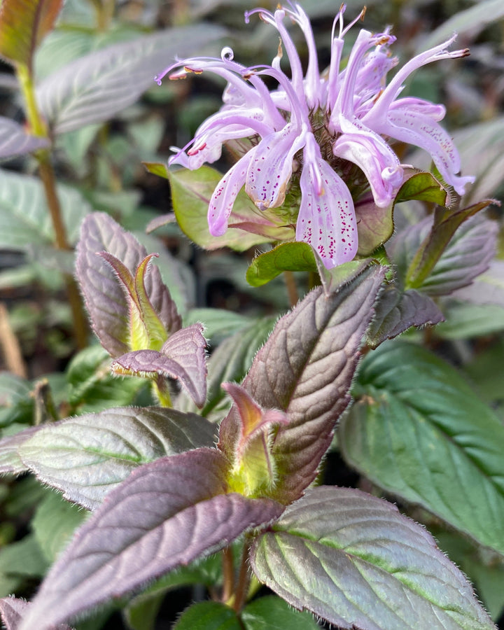 This native cultivar will be welcome addition to the sunny border with its mildew-resistance and clumping habit. The light pink, purple-spotted blooms appear earlier in the season that other beebalm, from late spring to summer, drawing hummingbirds and butterflies to the tubular flowers. Noted for its purple new growth and stems, the fragrant, low-growing foliage is loosely upright and grows 24" tall. PPAF. Plant 24" apart.