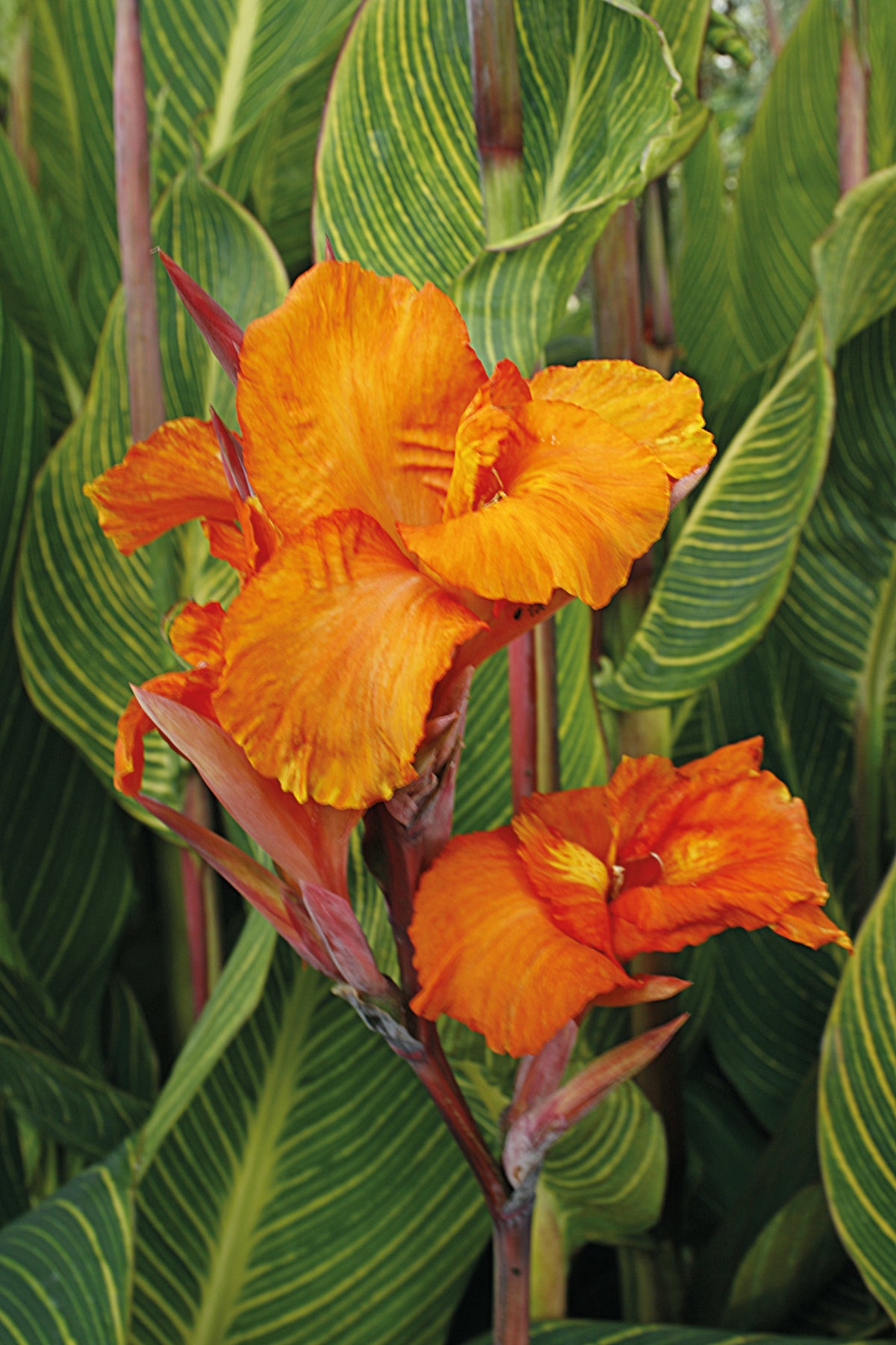 Talk about a tropical look, this rare, imported dwarf Canna is renowned for its striking variegated green, cream and yellow striped foliage with subtle "red-pencil" edging. Its large banana leaf qualities make it a gardener's dream. Removing flowering heads, which makes for tough decision-making, enhances foliage production. Foliage height is 2 - 21/2'. Its large orange flowers make it 4' overall. Plant 24" apart.