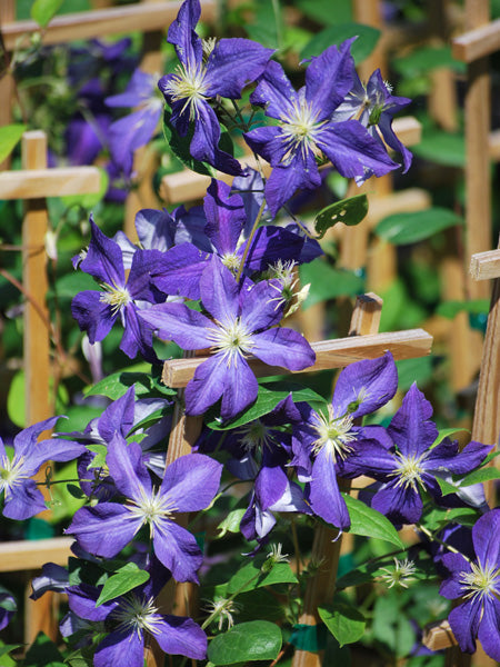 Train Clematis on arbors, walls, fences, poles or use them for screening a spot that's not so pretty, or to cover stumps. Clematis vines take from 2-3 years to become fully established. Our experience is that vines grown in full sun will produce heavier blooms for a shorter time period than those grown in partial shade where blooms won't be heavy but will extend over a longer time. Clematis will benefit from shade over their roots. Don't use heavy bark or leaf mulches in the summer as they can promote Clematis wilt. Keep the moisture level of your vines even-never very dry or very wet.
