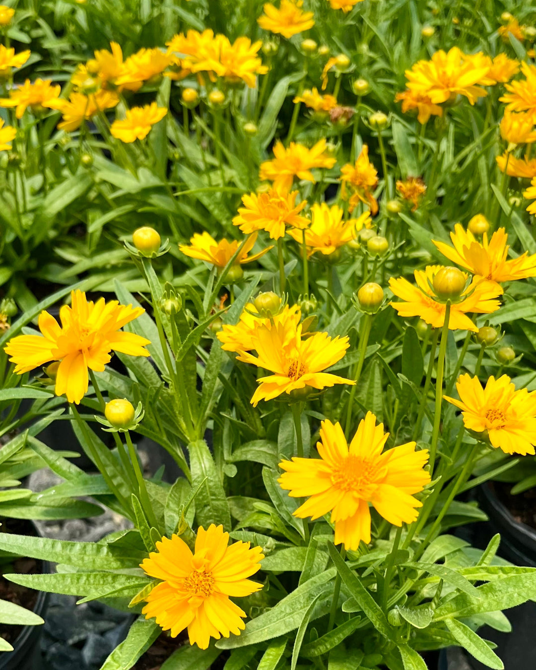 This early and long blooming Coreopsis provides double the golden yellow semi-double flowers than 'Early Sunrise'. Compact foliage grows 12-14" tall and is great for containers or the front of the border. Combine with purple Salvia, Geranium 'Rozanne' and Leucanthemum. Plant 14" apart.