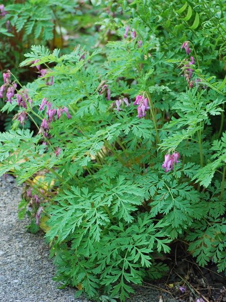 Myriads of heart-shaped rose-pink flowers stand 2-4" above grayish-green fern-like foliage, starting in May and continuing well into the fall. Effective by itself or in mixed plantings, this woodland native reaches 12-18" in height and does well in shade or sun. In the shady garden try it with Astilbe, Pulmonaria, blue or green leaved Hostas, and ferns. Plant 18" apart.