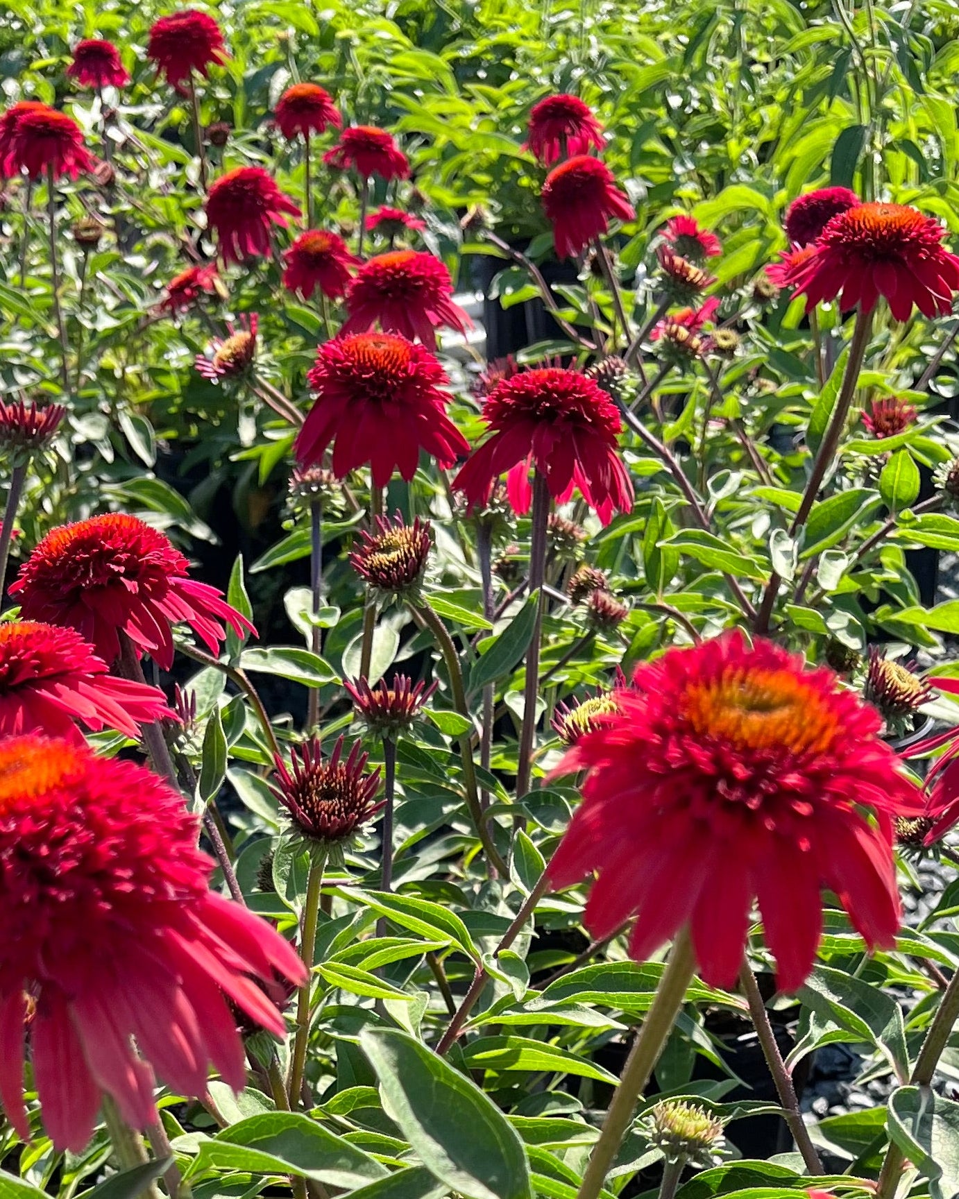 Deep red pom-poms with matching ray petals are served up on strong well-branched stems in summer! This new selection has improved branching and a more compact habit that produces a higher flower count than other double coneflowers. Height will be around 22-24" tall. Plant 18" apart. PPAF.