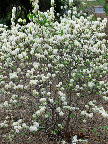 Fothergilla is a group of deciduous, spring-flowering shrubs known for fall color and fragrant flowers. We have chosen to grow 'Mt. Airy' because of its vigorous growth habit (to 5'), lovely autumn color, dependable cold hardiness, and the bonus of those white flowers that open as leaves emerge in spring. Fall color is most brilliant where this shrub is grown in full sun. Give it the moist, peaty, acid soil it prefers for best performance.