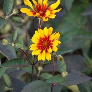 Come one, come all...butterflies and other pollinators hear the call. Contrasting golden yellow flowers with a large red eye sit atop plum-purple stems from mid-summer into fall. This showy native selection is tolerant of many soils types and grows 3-4' tall.