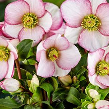 This new collection is bred from Christmas Roses for their winter blooms, Snow Roses for their robust habit and Lenten Roses for their variety of colors. Outward-facing blooms are light pink to white with a darker pink edge and appear in winter, blooming for several weeks atop dark green glossy foliage. Height is 13-24". Plant 24" apart.