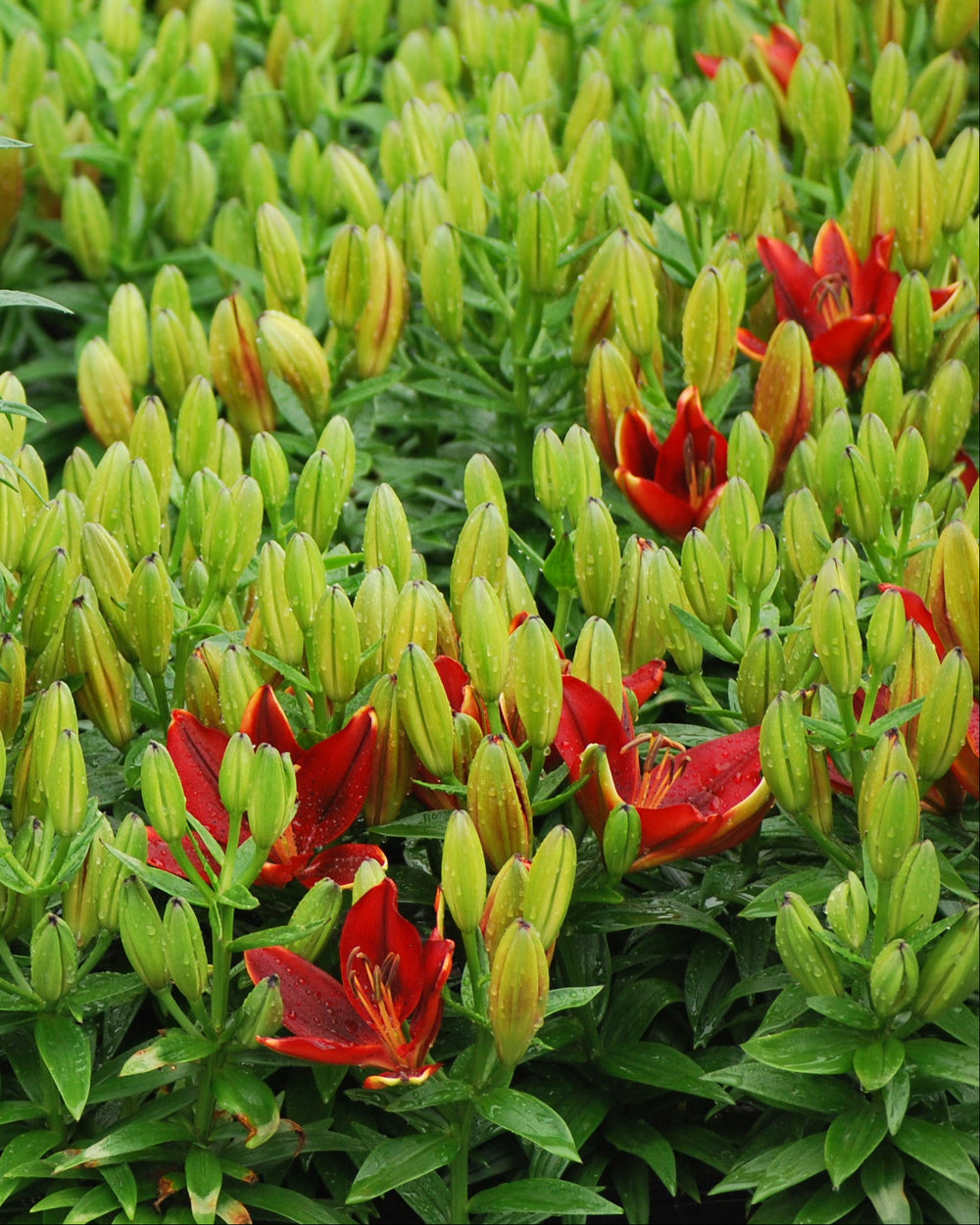 Bursting with color in mid-summer, these compact Lilies are offered in many bold and beautiful colors with very high bud counts and are perfect for the front of the border, rock garden, containers, or using as cut flowers. Provide good drainage. Dark red flowers have darker red highlights. Grows 14-16" tall with 4-6 buds per stem. PP#24500 Plant 12" apart.