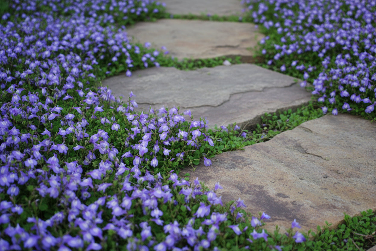 Quick to spread by rooting stems, this versatile ground cover forms a carpet of tight little light green leaves to a maximum height of 1". Abundant bright blue flowers dot the foliage in May-June. Able to handle some foot traffic, it is the perfect choice between stones on a path. Also works well as a carpet under rose bushes or in the rock garden. A tough ground cover, it will perform best in moist soil.