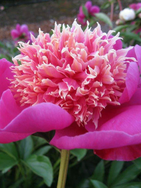 36" tall stems hold cup-shaped pink flowers filled with frilly pink and peach petaloids above the dark green vigorous foliage.Ã Fragrant blooms appear early in the season. Plant 24" apart.