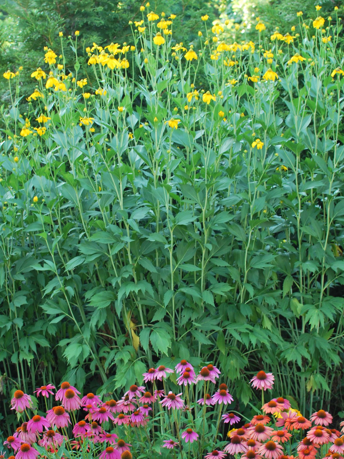 Large yellow coneflowers stand boldly 5-6' above the foliage in July and August and are easy to grow in any fertile garden soil. This native perennial has great architectural qualities, and combines well with our tall grasses, Heliopsis, and 'Black Eyed Susan'. Butterflies love it, and you will too. Plant 24" apart.