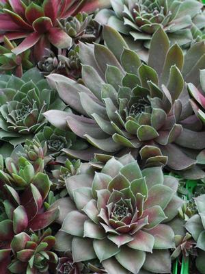 Who isn't cheered by this classic old-fashioned favorite? Succulent, pointy green rosettes, both large and small varieties, combine in shades of green and tan with red tips at about 3-4". Pink flowers appear in June. Easy to grow in a multitude of conditions, it is easy to account for the popularity of this sedum look-alike. New "chicks" form around the base of the plant, or "hen". Eventually the "hens" die out leaving the "chicks" to grow for the next year, and so forth. Perfect for the rock garden, trough or container, between sunny stepping-stones or clustered at the front of the border in lots of sun, don't forget these favorites of your grandmother.